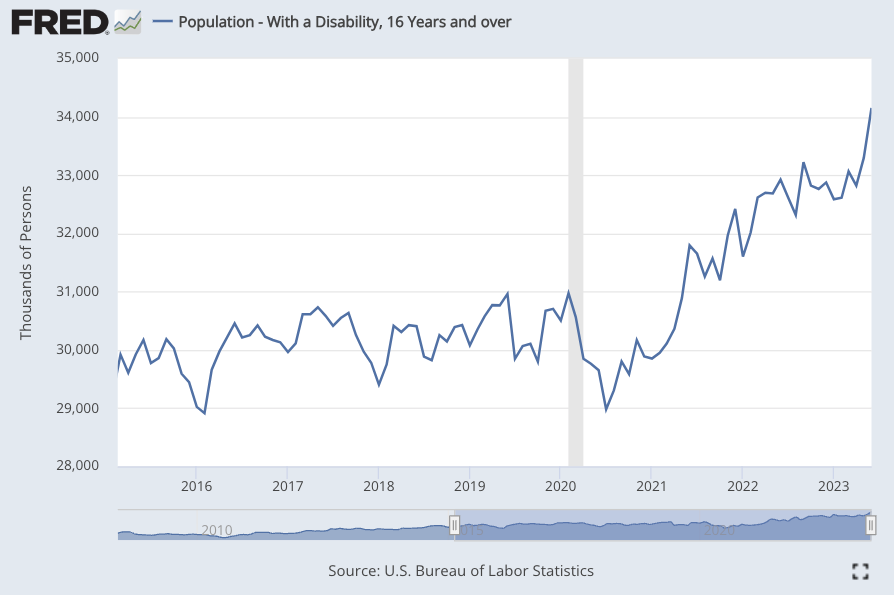 Also, this chart came up today. It looks like 10% of the population over 16 years of age is disabled, five million of which came after the injections.